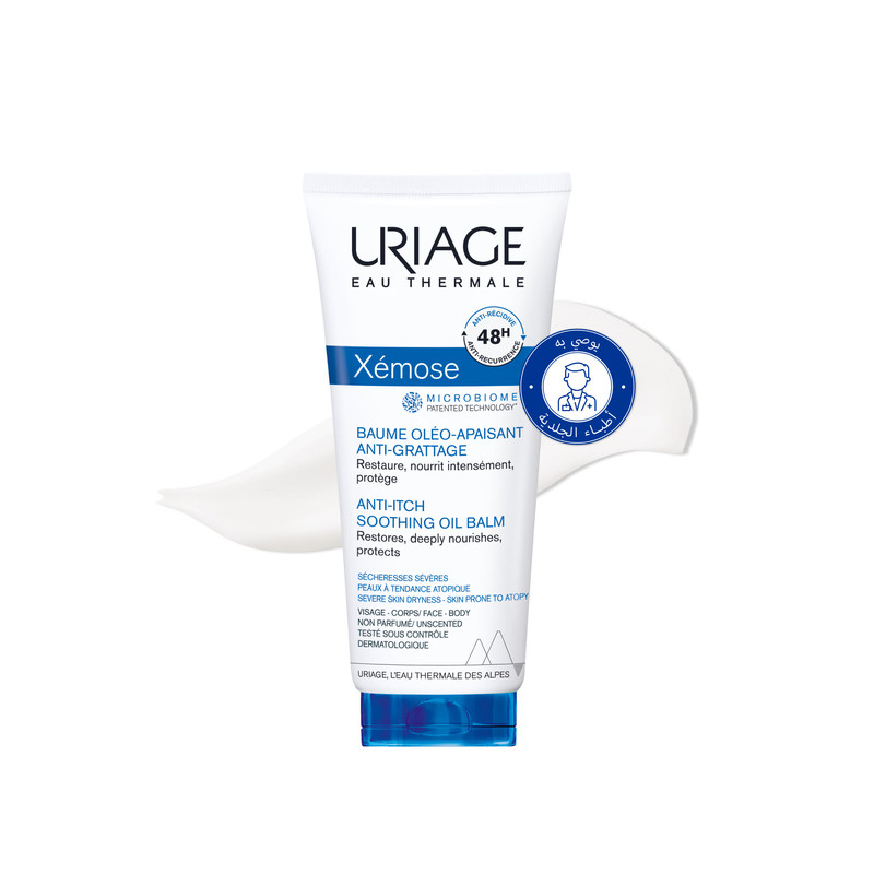 Le Baume Oléo-Apaisant Xemose d’URIAGE discount, le soin anti-grattage qui protège et apaise les peaux extrêmement sèches qui démangent avec grattage du visage et du corps de toute la famille ((bébé, enfant à adulte).