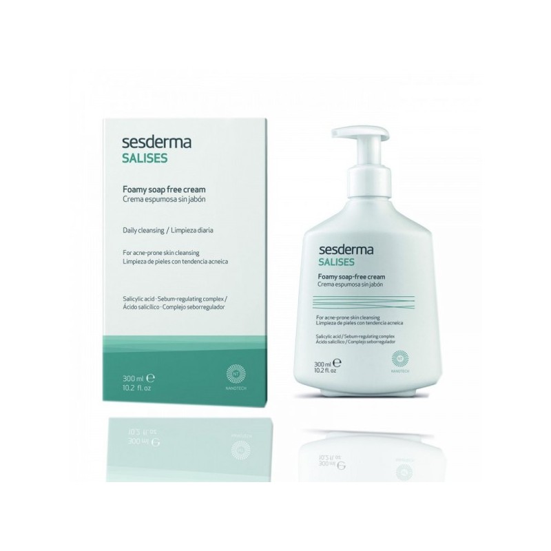 SESDERMA SALISES CRÈME MOUSSANTE SANS SAVON 300ml.Hygiène quotidienne du visage des peaux séborrhéiques et à tendance acnéique.Sesderma SALISES désincruste la graisse et nettoie les pores.Peut être un traitement unique ou associé à tout autre traitement anti-acné.Composition:2% Acide salicylique, Extrait d'avoine, 1% d'aloe vera, Extrait de camomille et mimosa, Triclosan.Conseils d'utilisation:Il est indiquer d'appliquer sur une peau humide puis réaliser un léger massage jusqu'à obtenir une mousse crémeuse.De rincer abondamment à l'eau claire.D'éviter le contact avec les yeux.NB : Il n'est pas photosensible, ni irritant